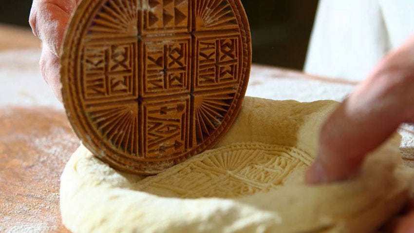 I should explain that Orthodox use a round loaf of bread, called Prosphora, for the Eucharist. Just flour, water, yeast, and salt. People in the congregation take turns baking it, with prayers.