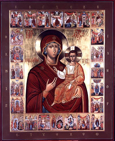 The Akathist Hymn is a lovely chanted prayer-poem that follows the life of Christ from the angel’s Annunciation to Mary, through to his flight into Egypt. The Akathist is mostly addressed to Mary, the Theotokos, God-bearer, and mostly reflecting in awe that God would choose to become incarnate. So for four weeks we do one-fourth of the Akathist, and in the fifth week we do the whole thing. (Some churches don’t do the one-fourths, but only the whole thing in the fifth week, so check local listings.)